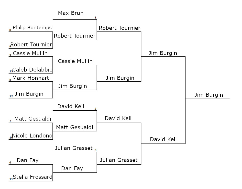 All of the games within the quarter finals thru the final game were nail biters. The final round between Jim Burgin and David Keil ended in a win in favour of Jim with a match score of 13 to 8.