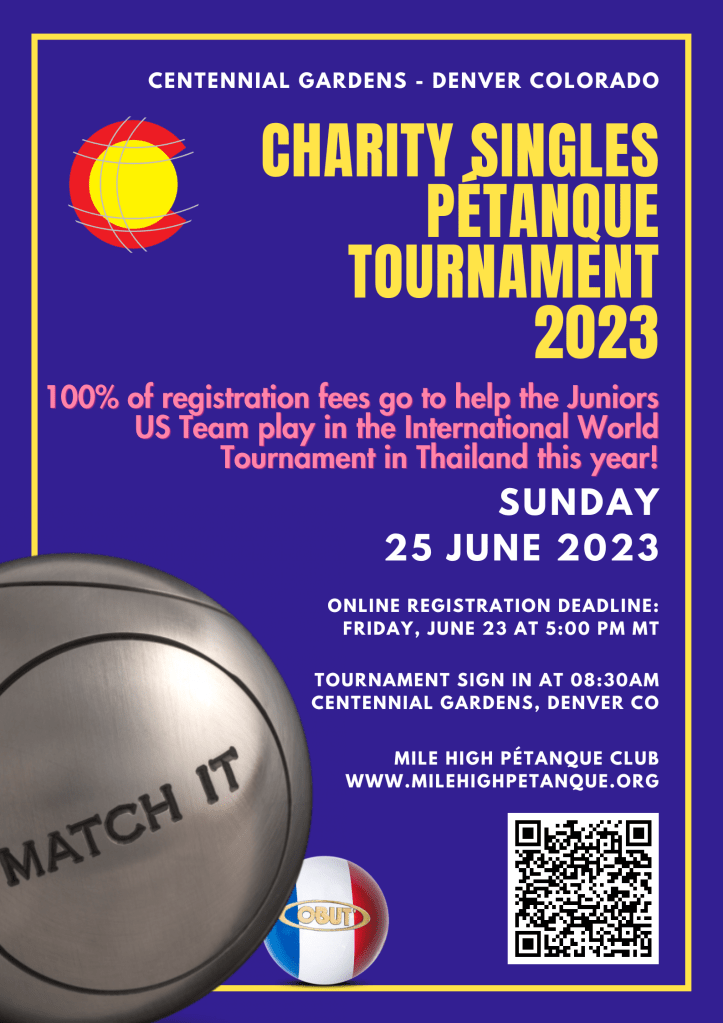 This year, Mile High Pétanque Club hosted an open Charity Singles Tournament, which is a heads-up 1v1 or “tête-à-tête” tournament, on Sunday June 25th 2023 at Centennial Gardens in downtown Denver Colorado. This was an open invitation 1v1 tournament for the public where 100% of all registration fees went to help pay for the US Juniors Team GoFundMe Fundraiser to help with their trip to Bangkok Thailand in November.